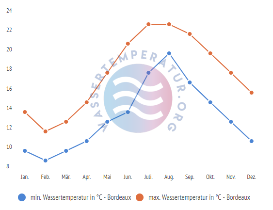 Minimale & maximale Wassertemperaturen in Bordeaux nach Monaten: