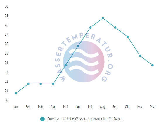Im Folgenden sind die durchschnittlichen Badetemperaturen im Roten Meer bei Dahab je Jahreszeit aufgeführt.
