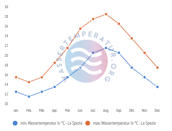 Die maximale Wassertemperatur vor La Spezia kann im Hochsommer bis zu 29 Grad betragen. Auch Anfang September kann noch eine Wassertemperatur von bis zu 27 Grad im Ligurischen Meer gemessen werden.