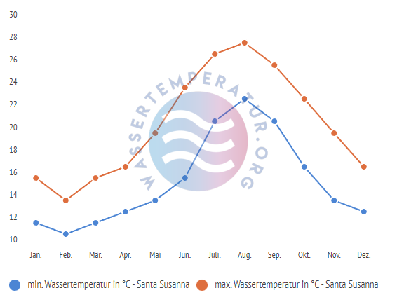 Minimale & maximale Wassertemperaturen in Santa Susanna nach Monaten: