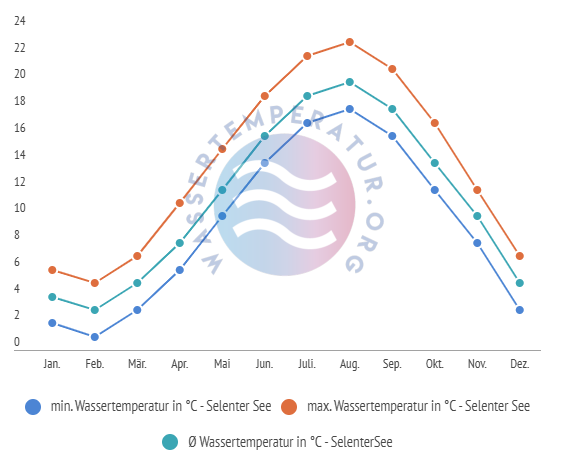 Durchschnittliche, Ø minimale & Ø maximale Wassertemperaturen im Selenter See nach Monaten: